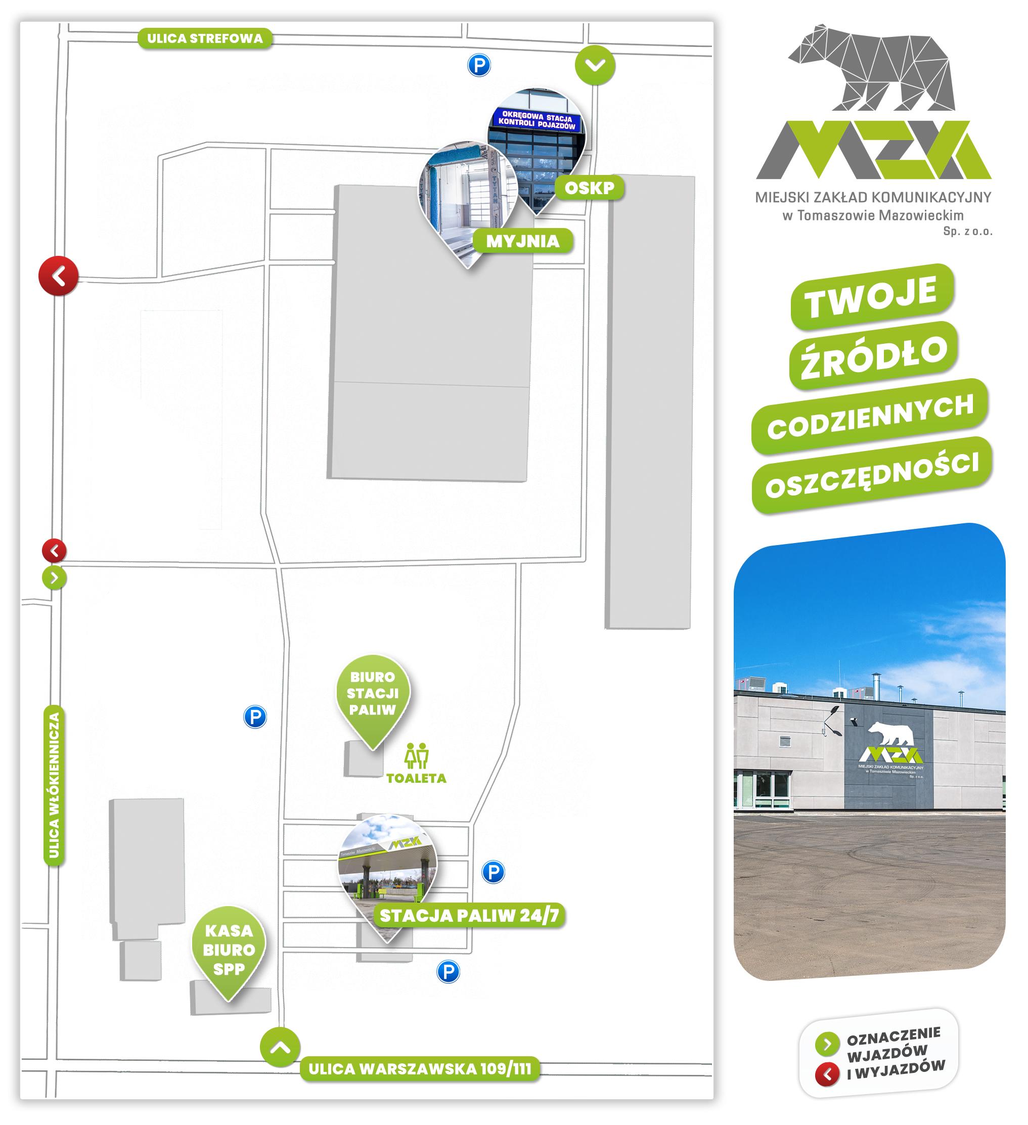 Adres: ul. Warszawska 109/111, Tomaszów Mazowiecki – wjazd dla samochodów ciężarowych i autobusów znajduje się od ul. Strefowej